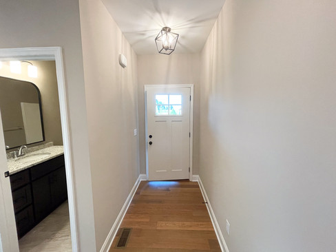 Walking in the front door, there is a foyer with a black lantern style fixture. People love this floor plan because you cannot see into the main living, kitchen, dining space when you walk in the front door.