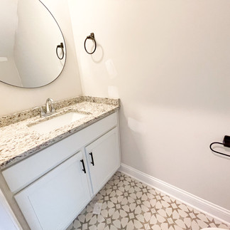 Tucked under the stairs is a half bath. It has a fun tile floor and cute round mirror.
