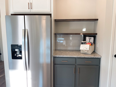 The cabinets all have gold bar pulls, adding a little sparkle! This floor plan has a full sized pantry in the kitchen and floating shelves. The perfect spot for a coffee bar!