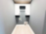 In the laundry room, there are cabinets above the washer and dryer. The walls are painted a fun navy color!